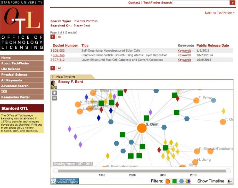 Results. Incorporating Visible Legacy widgets into an existing site such as Stanford OTL TechFinder adds visual presentation of information, enhances site navigation, disambiguates topics, and makes the site more "sticky" by encouraging users to explore related projects and identify additional relevant researchers and innovations.