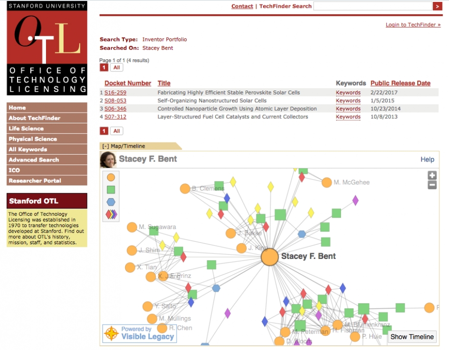The "TechFinder" Technology Transfer Portal offered by the Stanford Office of Technology Licensing (OTL) now features embedded widgets from Visible Legacy. Designed to facilitate the transfer of research into solutions, the widgets visually map the connections between projects, researchers, patents and publications, empowering users to more quickly grasp the context of the innovations and expertise within Stanford’s $2 billion/year research ecosystem.