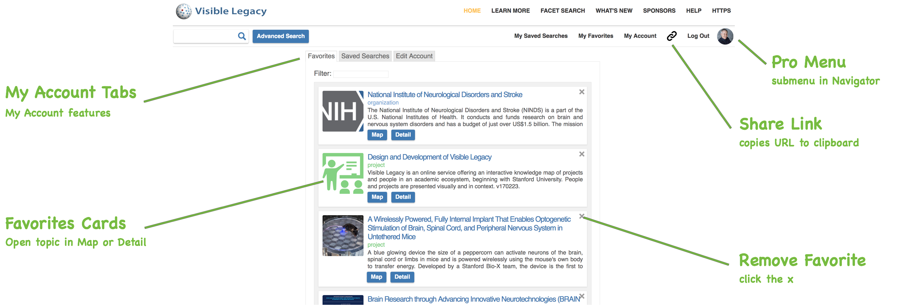 The Visible Legacy My Account page is where you can view and edit your Favorite topic selections and saved searches. To use the My Account features, please Log In to the Visible Legacy Navigator site by creating an account or using a social login. When Logged In, you will see the Pro menu with My Saved Searches, My Favorites, My Account, Share Link, and Log Out.