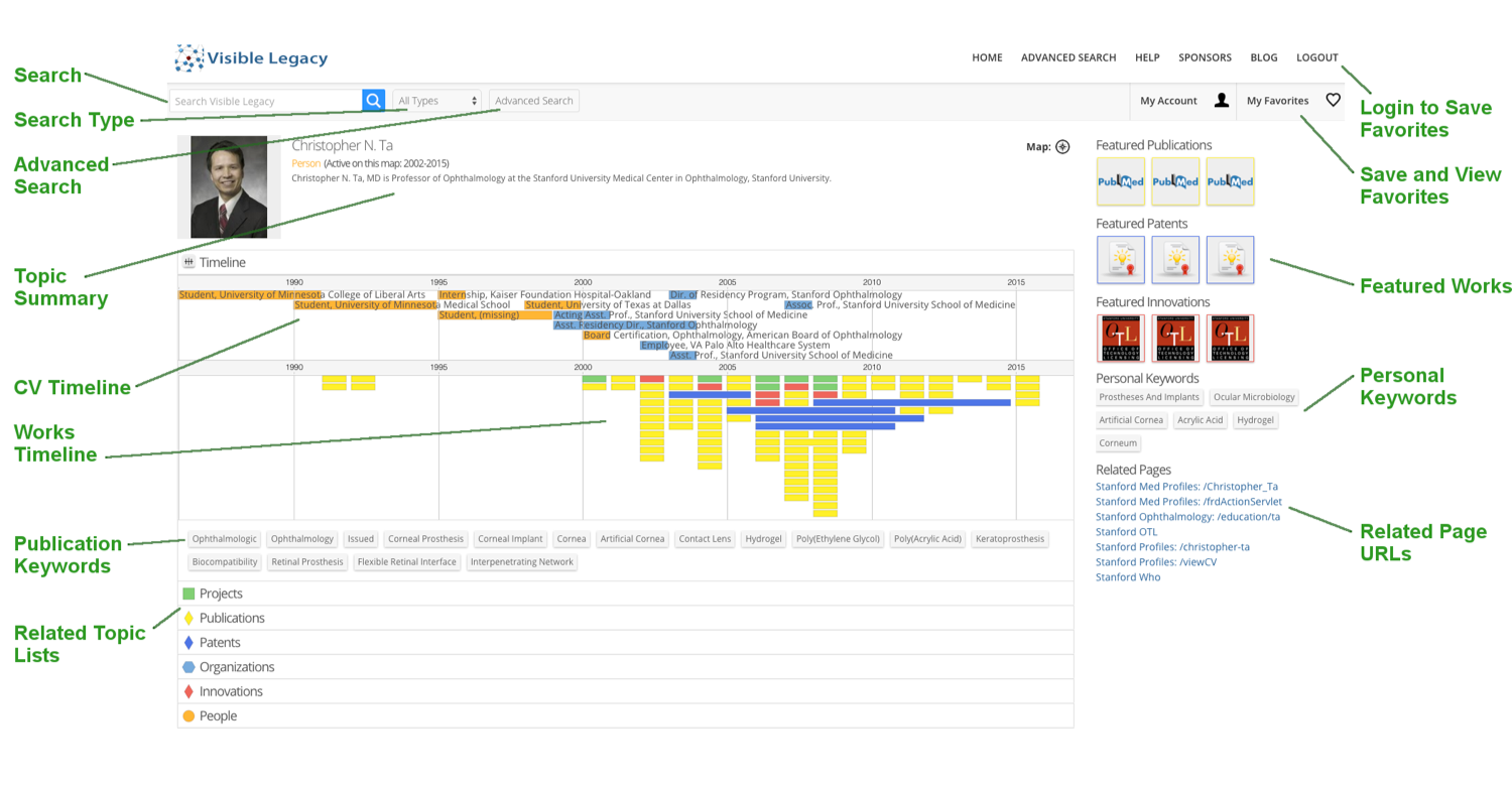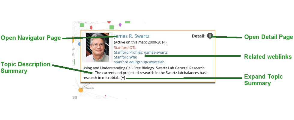 After rolling over a node and clicking the small box you will open a larger Callout box (shown above) containing more information about the node. Each call-out has related links depending on the kind of node, for example researcher profiles and lab sites, project description sites, and related TechFinder pages shown in red. You will also find a Topic Summary with a paragraph expanded by using the small [+] at the end. Some topics include Keywords which will open a new window in Stanford OTL TechFinder using this keyword as the search term.