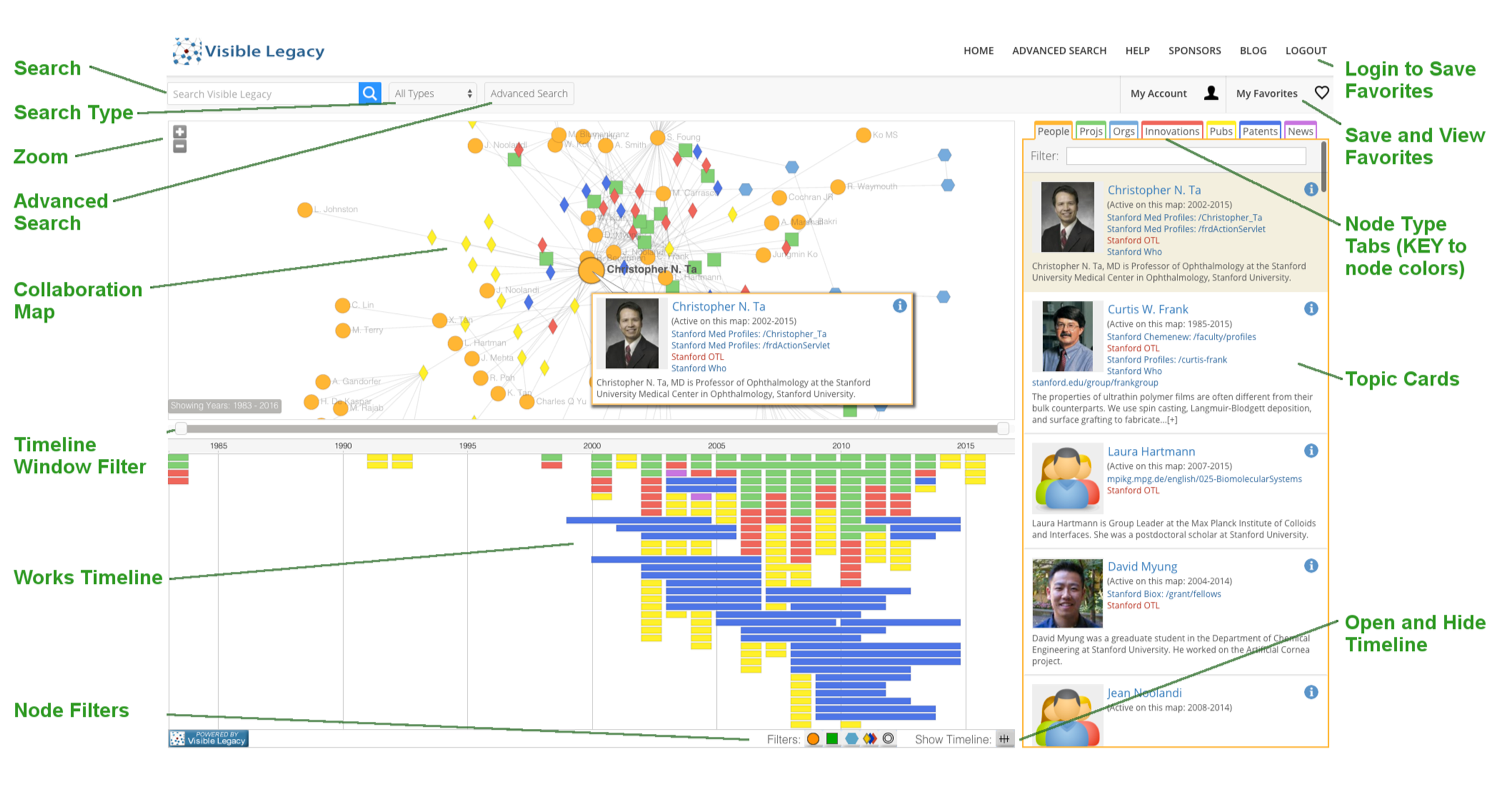 The Visible Legacy Navigator shows you a great deal of information from one search. You have many ways to view and filter the results. You can then easily navigate from project to project through the connections of people, organizations and documents, discerning relationships and discovering new insights. Then dive into the details about a topic of interest. The left panel of Navigator offers the Search, Collaboration Map, timeline and filters. The right panel contains Collaboration Tabs which list related topics by node type.